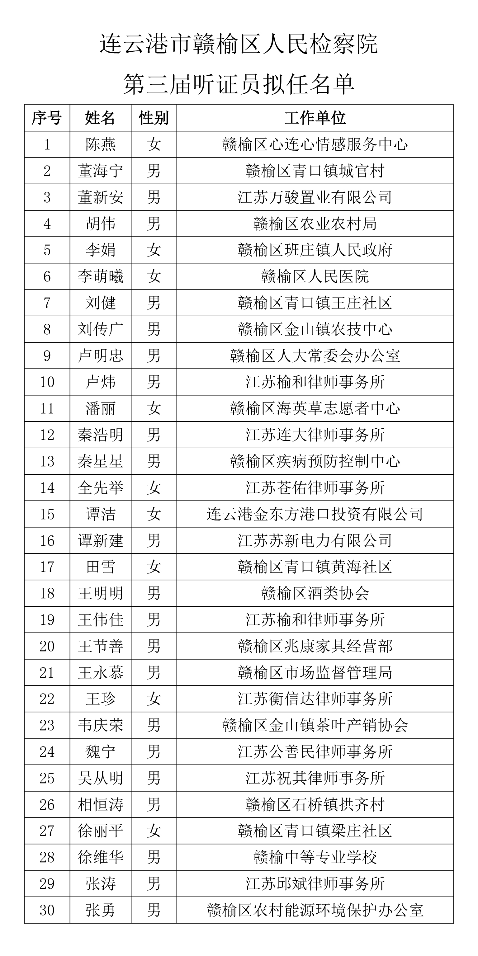 根据《人民检察院审查案件听证工作规定》和《人民检察院听证员库建设管理指导意见》的规定要求,按照相关程序并经研究决定,拟选陈燕等30名同志为连云港市赣榆区人民检察院听证员。现将拟任听证员有关情况予以公示(按照姓氏拼音排列),接受社会监督,如有不同意见,请在公示期内来电或者来信反映。