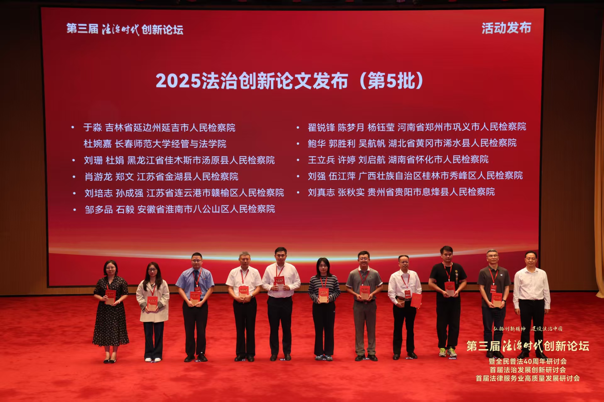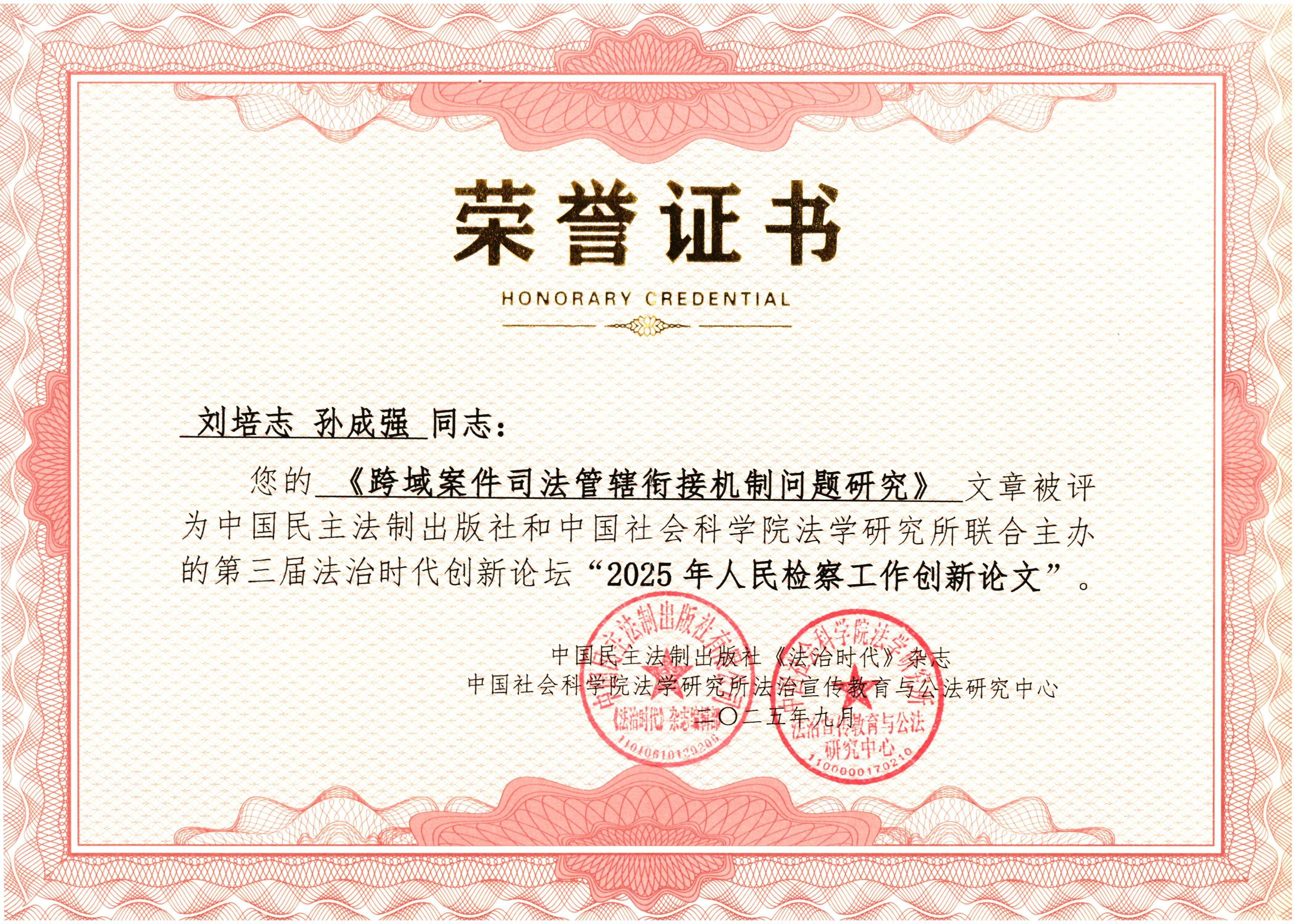 此次论坛以"深入学习宣传习近平法治思想、集中展示法治中国建设成就、发挥创新示范引领作用"为核心主题,是全国法治领域极具影响力的高端交流平台。组委会共收到各项申报1000多件,最终评审出“2025年人民检察工作创新论文”32件。其中,赣榆区检察院刘培志、孙成强同志撰写报送的《跨域案件司法管辖衔接机制问题研究》被评为第三届法治时代创新论坛“2025年人民检察工作创新论文”。
